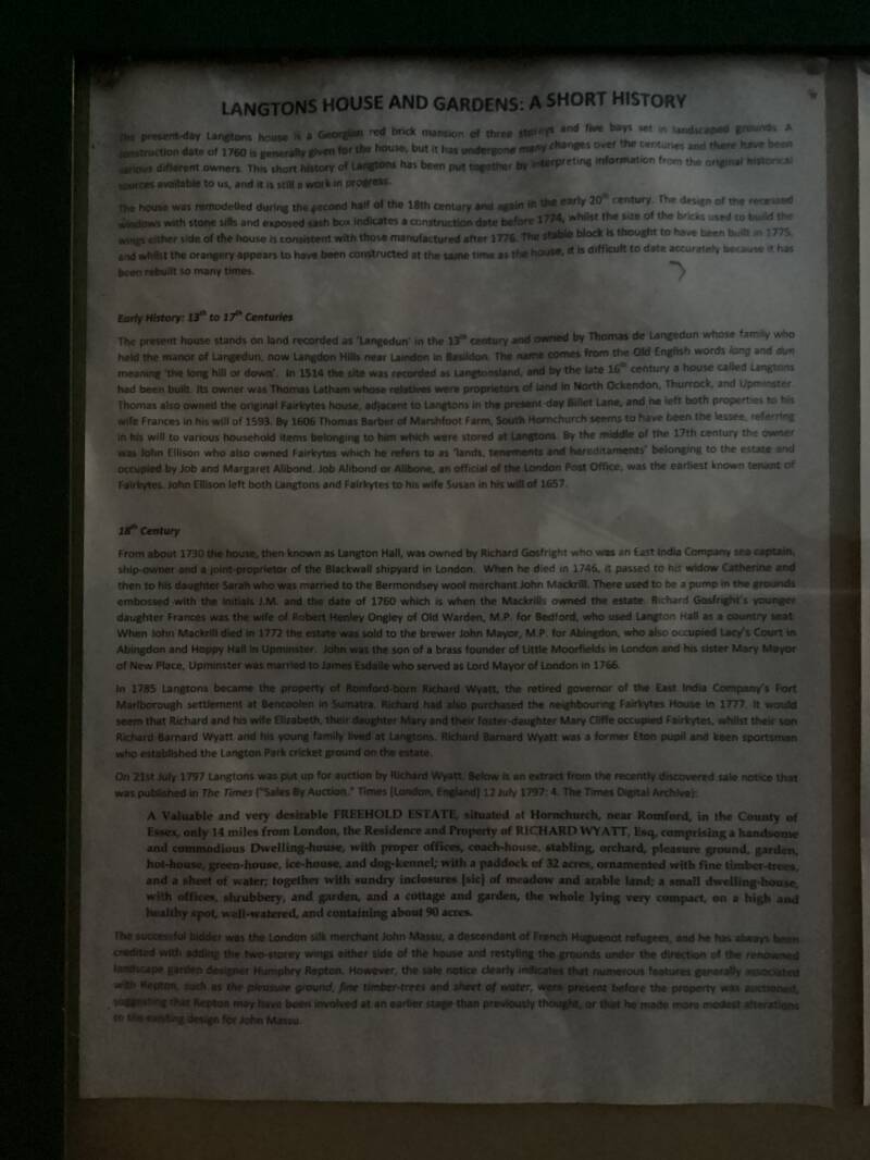 In 1797 Langtons as it was once again known was purchased by John Massu, a wealthy man of Huguenot extraction when it was put up for auction by Richard Wyatt. Massu modernised Langtons adding two two-storey wings to the house. It was John Massu who commissioned Repton to weave his magic on the four or so acres of garden. Professor Ged Martin in the Romford Recorder describes Langtons as ‘a gem, a bit of Kew Gardens in the middle of Hornchurch.’ Repton didn’t hold back when he set about constructing a serpentine lake, an orangery, a glasshouse (now used for weddings) and a gazebo. The bath house that stood next to the lake came later, in the early 19th century. The Land of the Fanns website, a five year partnership to rediscover and herald London as it once was, notes that Repton’s design incorporated paths, walls, a lake, gardener’s bothies, a ‘mazy’ shrubbery, an enclosed orchard and fine timber trees.